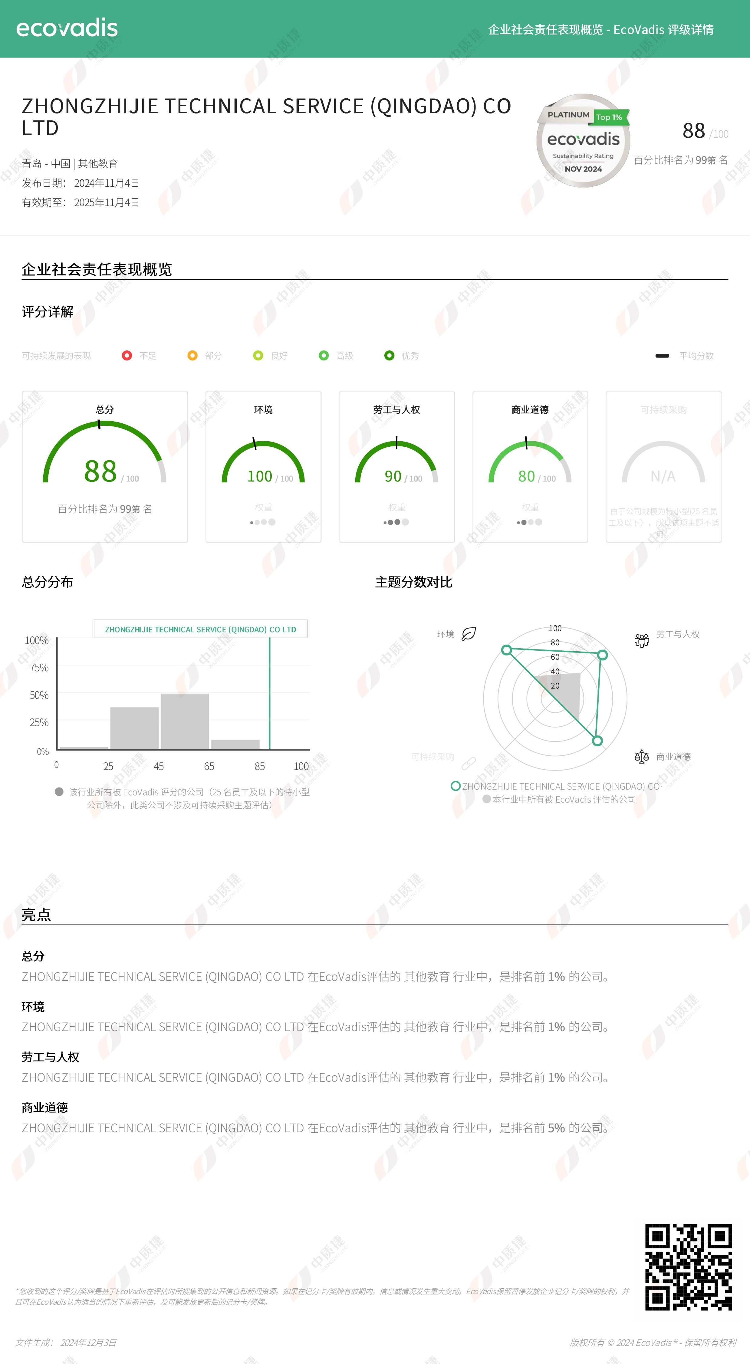 ,全球超過130,000家被評估的公司中,這一評級代表著中質捷躋身前1%的頂尖企業之列,截止目前2024年鉑金獎牌中國僅9家企業獲得。